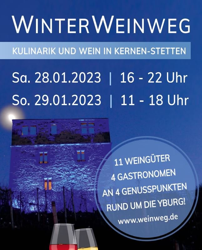 Genießen Sie entlang unseres Winterweinwegs edle Weine und gepflegte Gastronomie, inmitten einer winterlichen, stimmungsvoll beleuchteten Landschaft. Es erwarten Sie elf Weingüter und vier Gastronomen aus Kernen an vier Genussstationen rund um die Yburg in Kernen-Stetten. Samstag, 28. Januar 16 - 22 Uhr Sonntag, 29. Januar 11- 18 Uhr Beim Genusspunkt 2 "Am Wetterstein" laden wir [...]